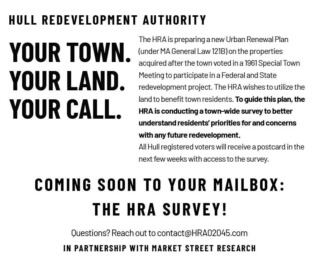 As the HRA Urban Renewal Plan is developed for review and approval by the DHCD the HRA will keep progress and update current on this site. Our public meeting schedule can be found on the website for the Town of Hull.